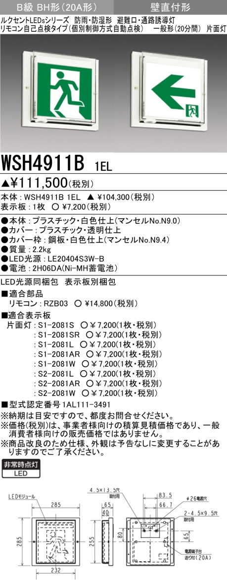 商品品番:WSH4911B1EL+S1-2081L品名:非常口・避難口・防湿・防雨型誘導灯B級BH形(20A形)片面型セット(左向・左矢印パネル付)