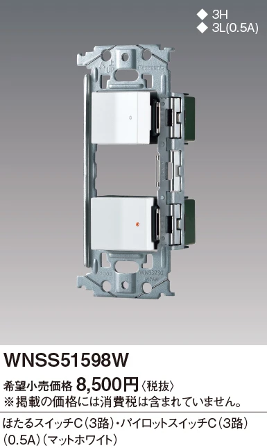 品番:WNSS51598W品名:SO-STYLE埋込スイッチセット(ほたるスイッチC、パイロットスイッチC0.5A)(マットホワイト)