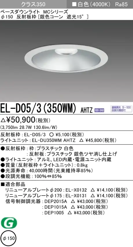 ダウンライト(深枠タイプ) 埋込穴Φ125 クラス60 白色 EL-D06/2(062WM) AHZ