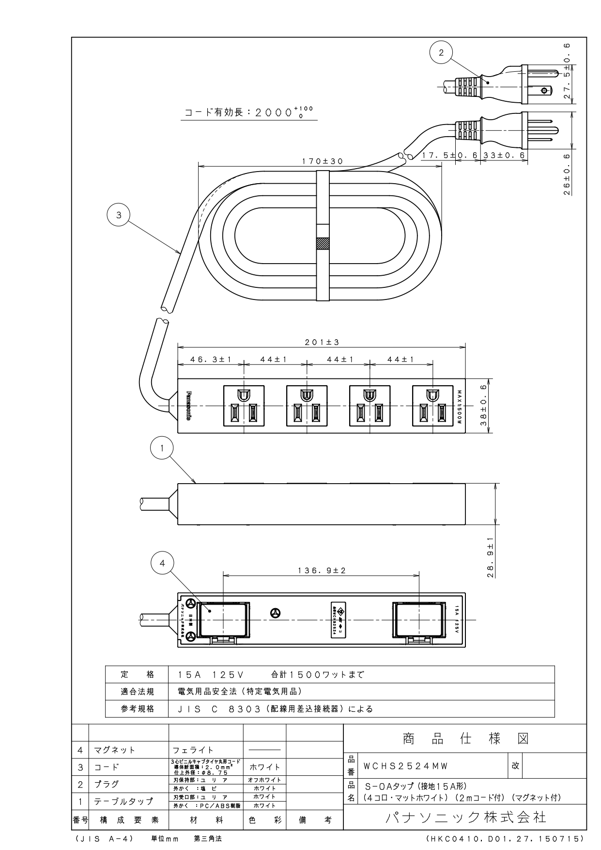 品番:WCHS2524MW品名:S-OAタップ(接地15A形)(4コ口・マットホワイト)(2mコード付)(マグネット付)