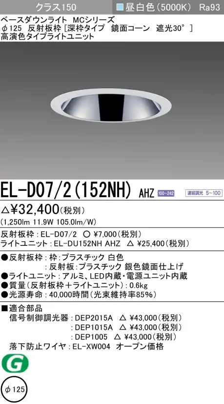 ダウンライト(グレアソフト) 埋込穴Φ125 クラス150 白色 EL-D10/2(152WH) AHZ