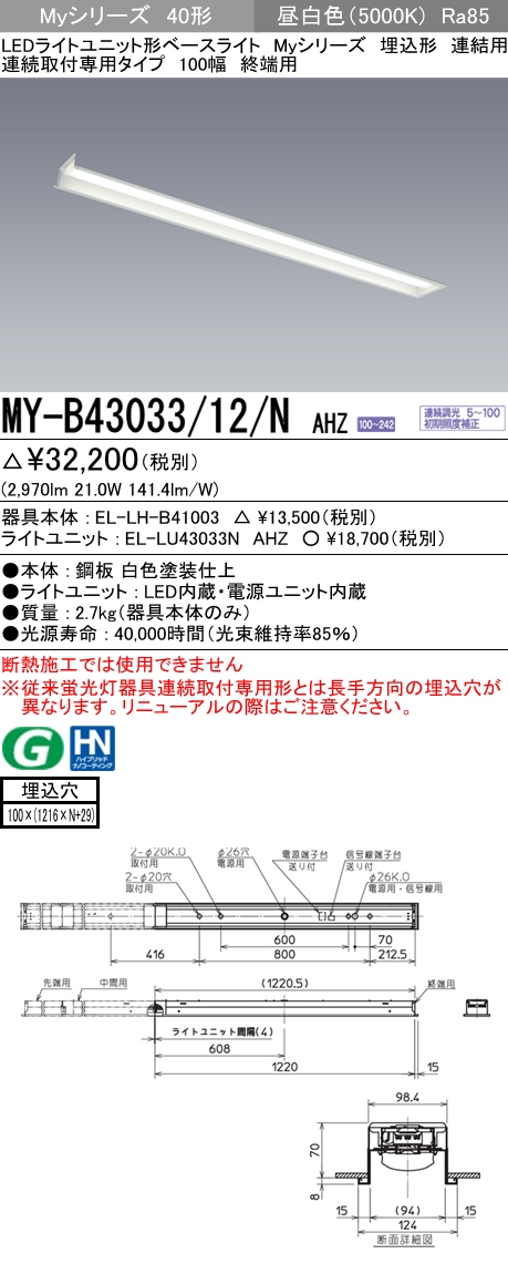 MY-B43033/12/N AHZ 埋込形ベースライト 連結用 100幅 一般タイプ FHF32(高出力)x1相当 【終端用】 昼白色 調光タイプ