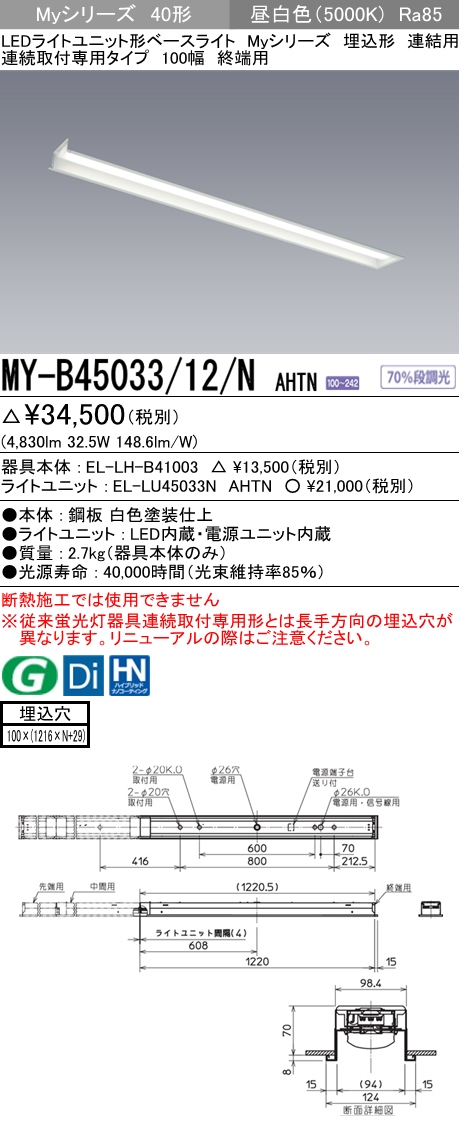 MY-B45043/12/N AHTN 埋込形ベースライト 連結用 100幅 一般タイプ FHF32(定格)x2相当 【終端用】 昼白色
