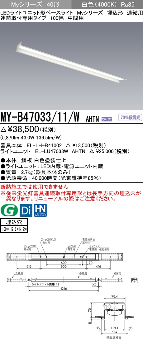 MY-B47043/11/W AHTN 埋込形ベースライト 連結用 100幅 一般タイプ FHF32(高出力)x2相当 【中間用】 白色