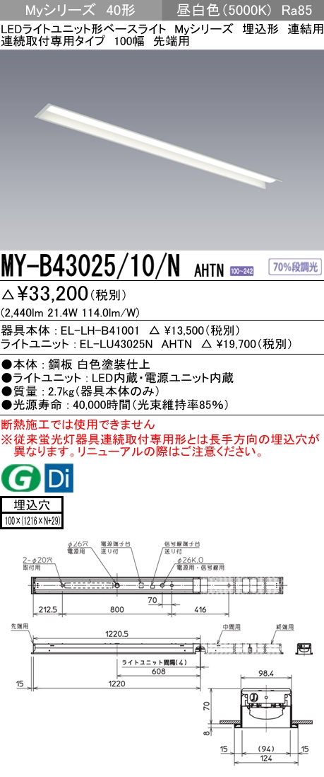 MY-B43025/10/N AHTN 埋込形ベースライト 連結用 100幅 グレアカットタイプ FHF32(高出力)x1相当 【先端用】 昼白色