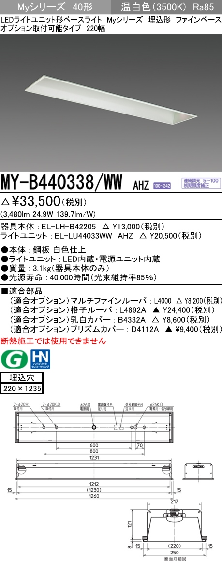 MY-B440338/WW AHZ 埋込形ベースライト オプション取付可能形 220幅 一般タイプ FLR40x2相当 温白色 調光タイプ