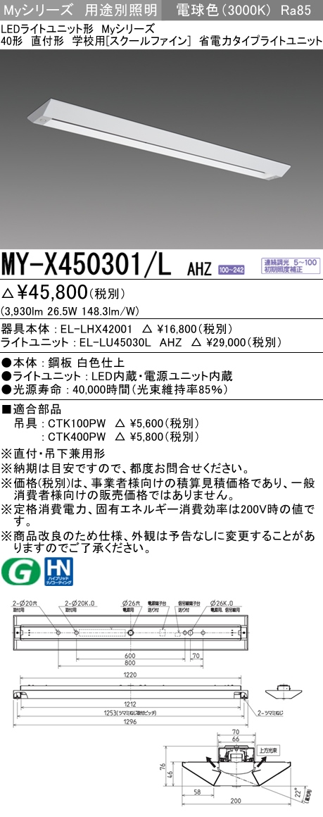MY-B430337/L AHZ 埋込形ベースライト オプション取付可能形 150幅 一般タイプ FHF32(高出力)x1相当 電球色 調光タイプ