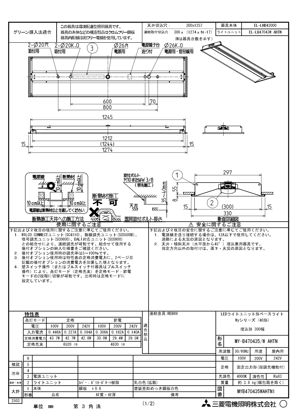 - 照明器具 > 三菱電機 > 埋込形ベースライト > 40形 下面開放タイプ 300幅