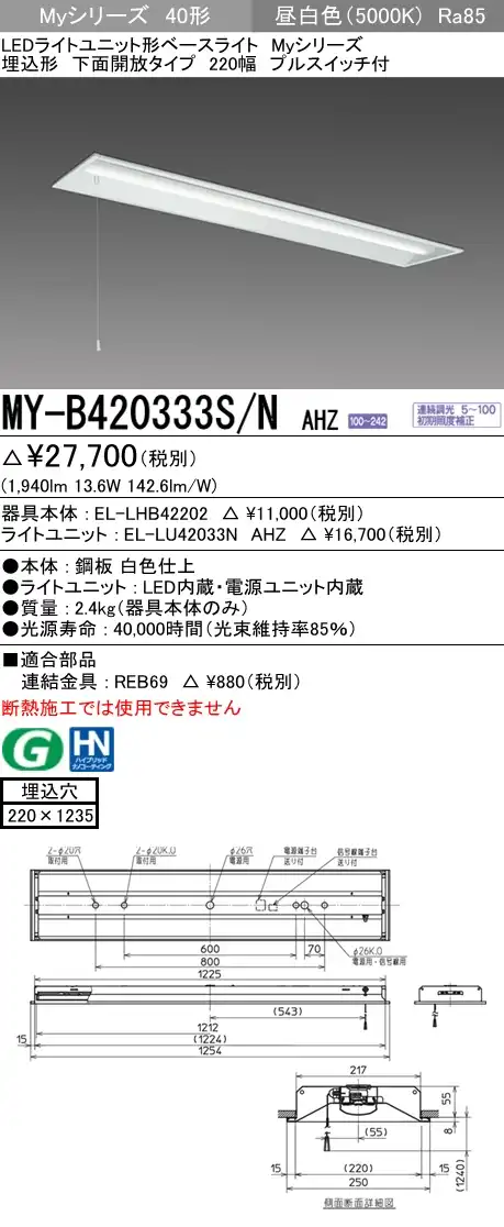 MY-B420333S/N AHZ 埋込形ベースライト 220幅 一般タイプ FLR40x1相当 プルスイッチ付 昼白色 調光タイプ