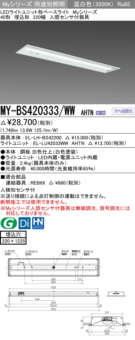 MY-BS420333/WW AHTN 埋込形ベースライト 220幅 一般タイプ FLR40x1相当 人感センサー付 温白色
