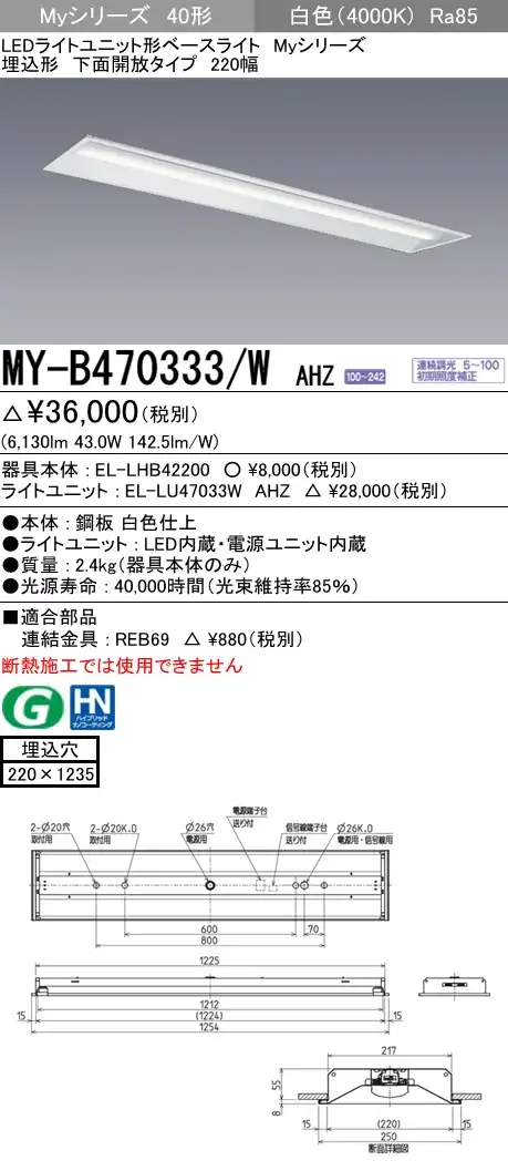 MY-B470433/W AHZ 埋込形ベースライト 220幅 一般タイプ FHF32(高出力)x2相当 白色 調光タイプ