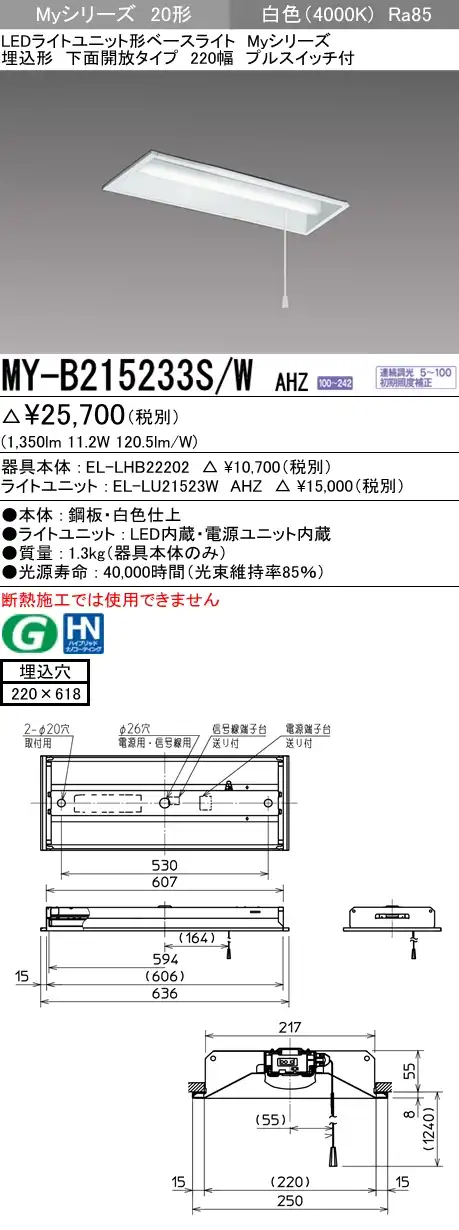 MY-B215433S/W AHZ 埋込形ベースライト 220幅 一般タイプ FHF16(高出力)x1/FL20x2相当 プルスイッチ付 白色 調光タイプ