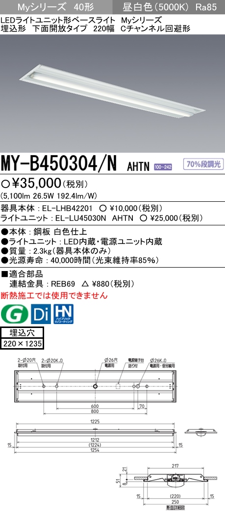 MY-B450404/N AHTN 埋込形ベースライト 220幅 Cチャンネル回避形 省電力タイプ FHF32(定格)x2相当 昼白色