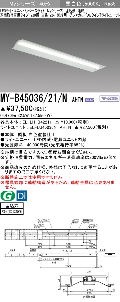 MY-B470402S/WW AHZ 埋込形ベースライト 190幅 省電力タイプ FHF32(高出力)x2相当 プルスイッチ付 温白色 調光タイプ