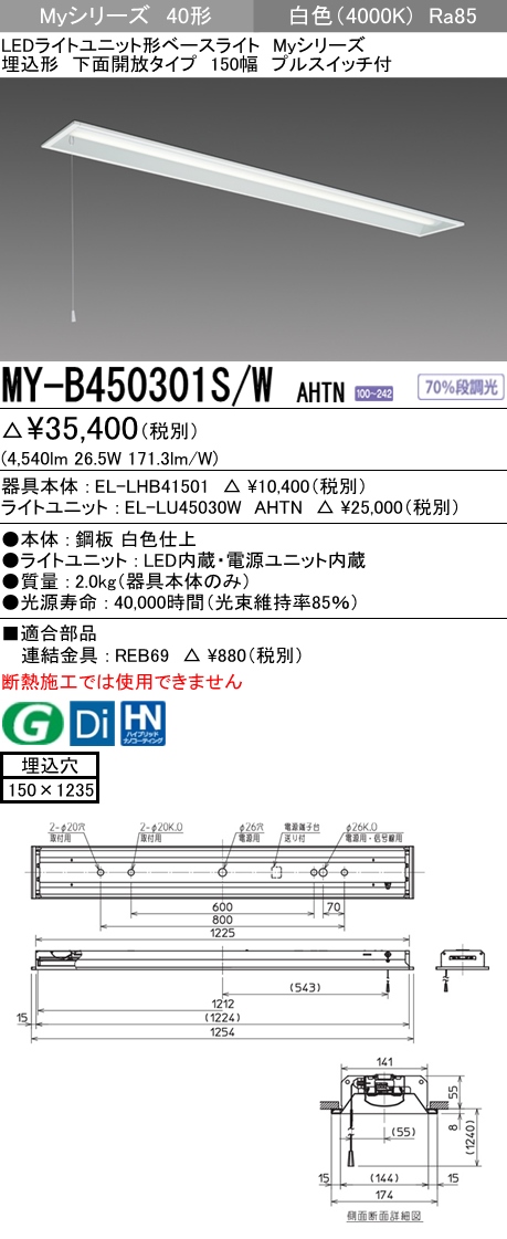 MY-B450401S/W AHTN 埋込形ベースライト 150幅 省電力タイプ FHF32(定格)x2相当 プルスイッチ付 白色