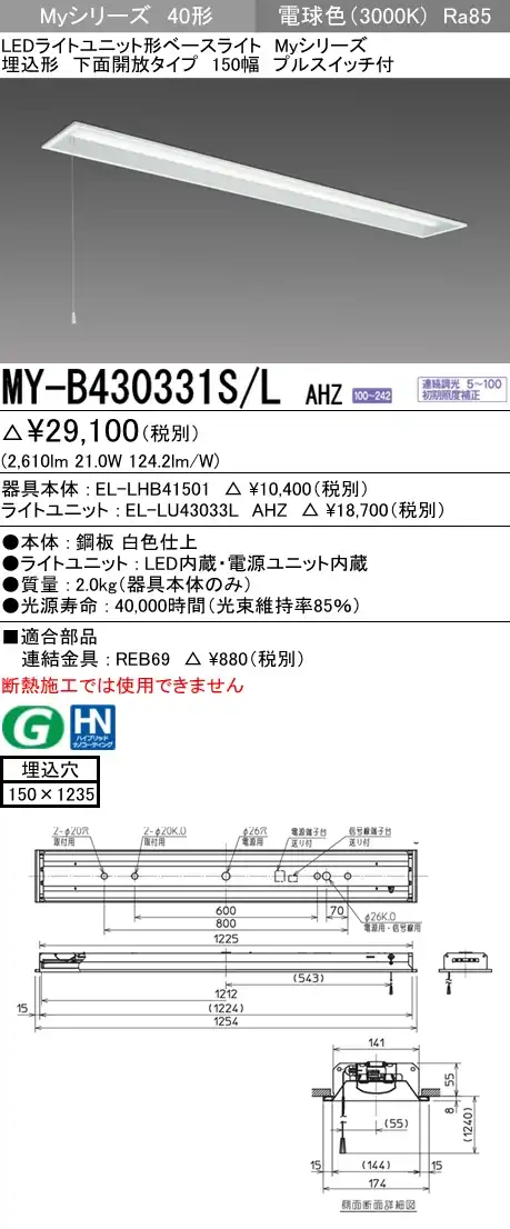 MY-B430331S/L AHZ 埋込形ベースライト 150幅 一般タイプ FHF32(高出力)x1相当 プルスイッチ付 電球色 調光タイプ