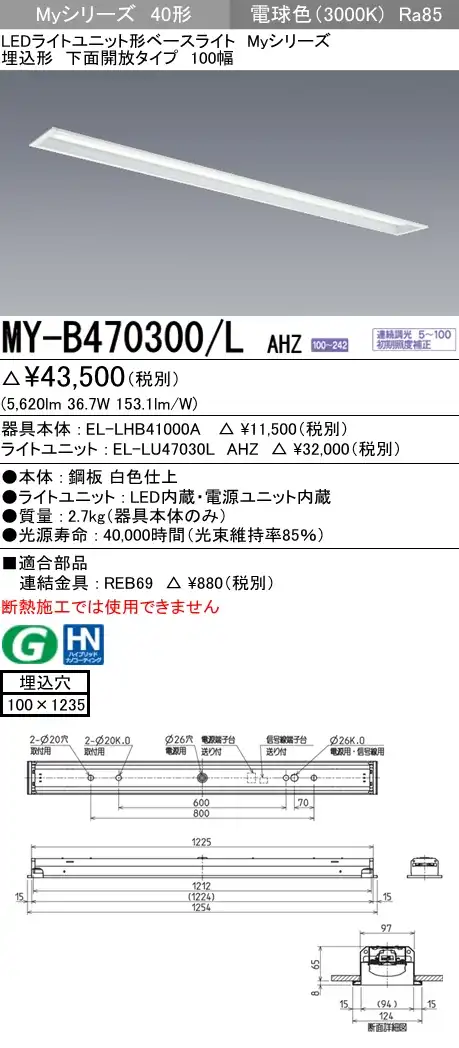 MY-B470400/L AHZ 埋込形ベースライト 100幅 省電力タイプ FHF32(高出力)x2相当 電球色 調光タイプ