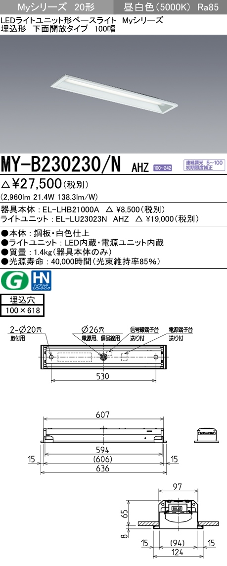 MY-B230430/N AHZ 埋込形ベースライト 100幅 一般タイプ FHF16(高出力)x2相当 昼白色 調光タイプ