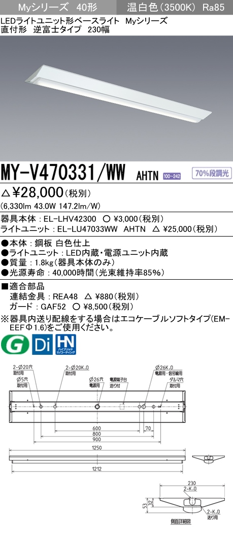 MY-V470431/WW AHTN 逆富士形(V形)照明器具 230幅 一般タイプ FHF32(高出力)x2相当 温白色