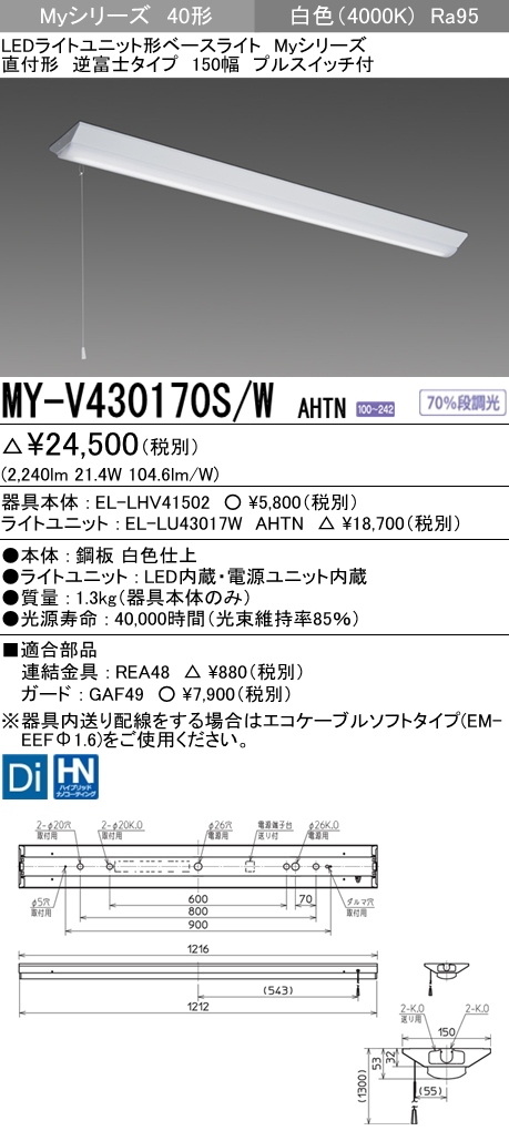 MY-V430170S/W AHTN 逆富士形(V形)照明器具 150幅 高演色タイプ FHF32(高出力)x1相当 プルスイッチ付 白色