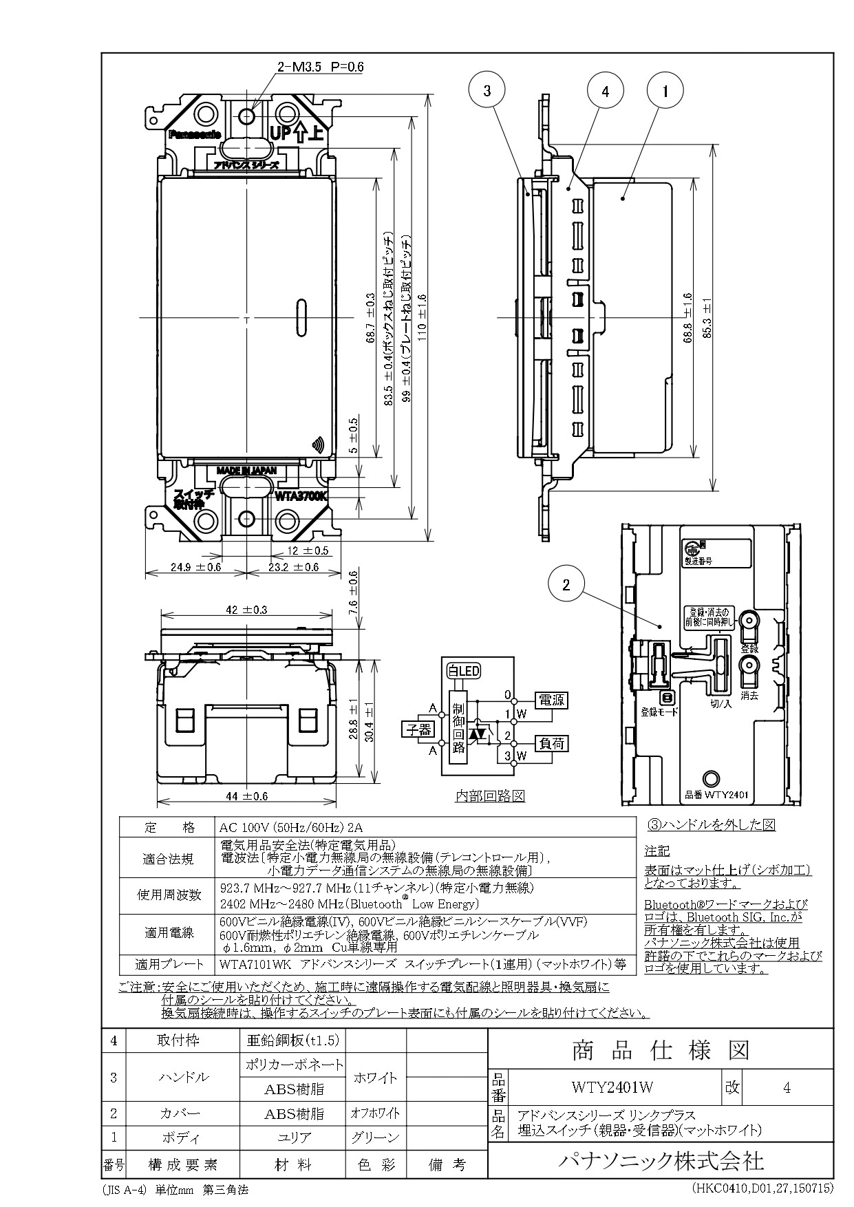 品番:WTY2401W品名:アドバンスシリーズリンクプラス埋込スイッチ(親器・受信器)(マットホワイト)