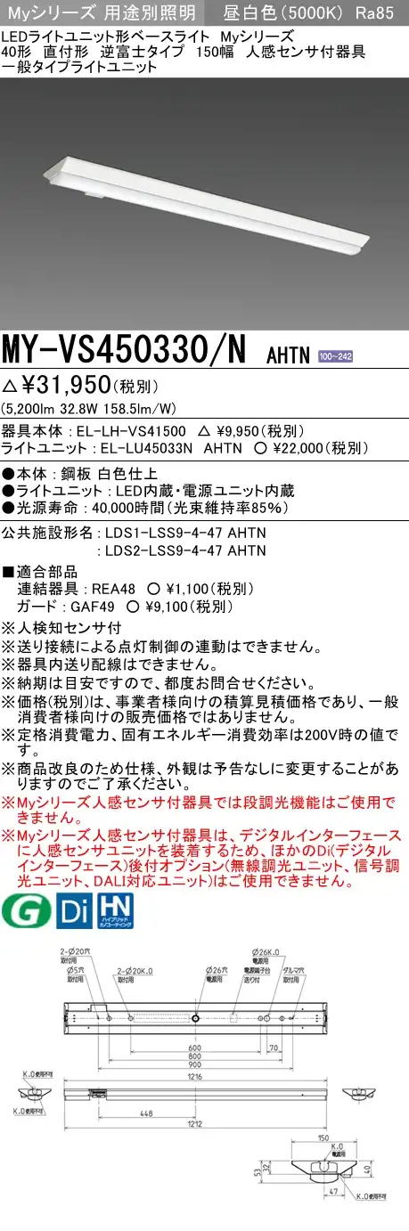 MY-VS450330/N AHTN 逆富士形(V形)照明器具 150幅 一般タイプ FHF32(定格)x2相当 人感センサー付 昼白色