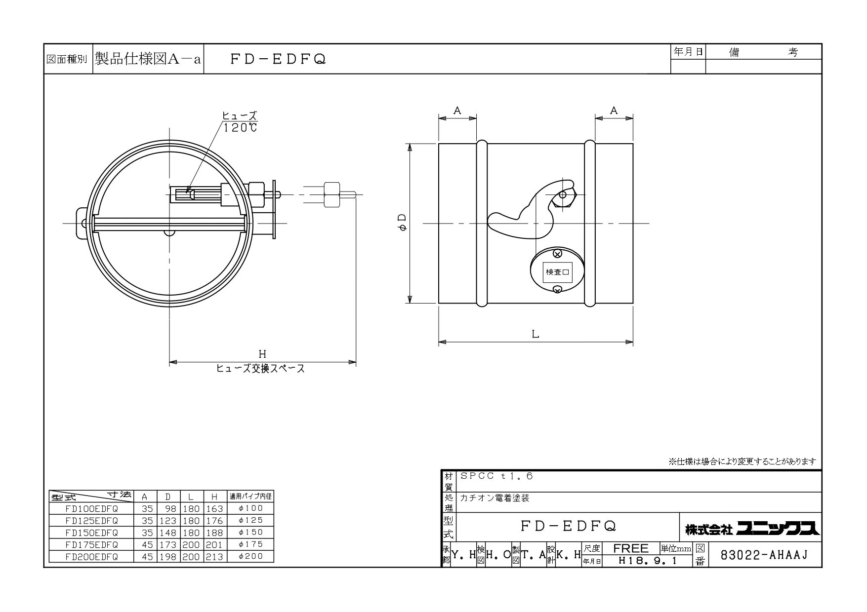 FD175EDFQ 鉄製防火ダンパー ダクト接続用 175φ 120℃型式