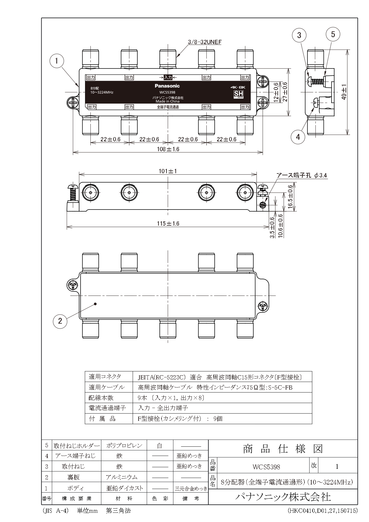 品番:WCS5398品名:8分配器(全端子電流通過形)(10~3224MHz)