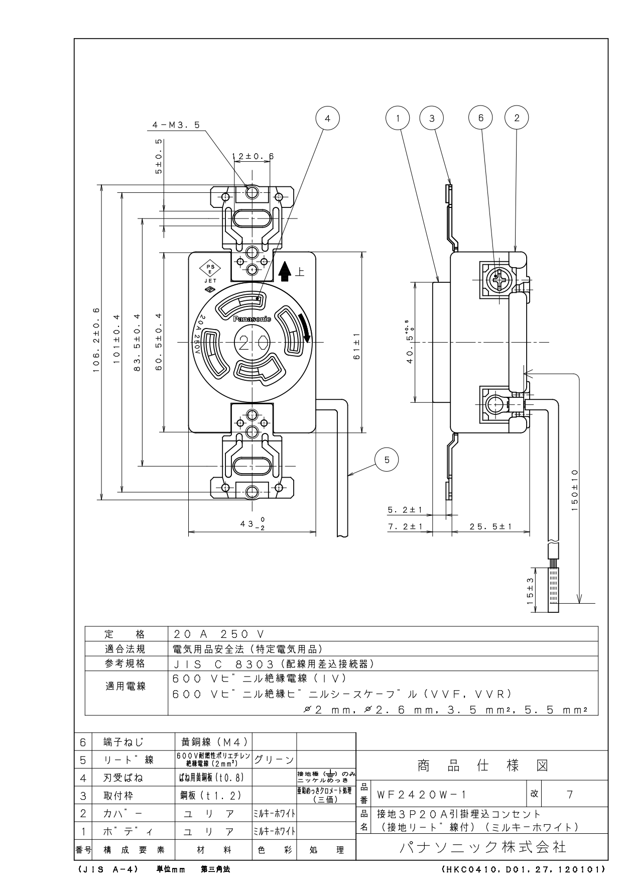 品番:WF2420W1品名:接地3P20A引掛埋込コンセント(接地リード線付)(ミルキーホワイト)