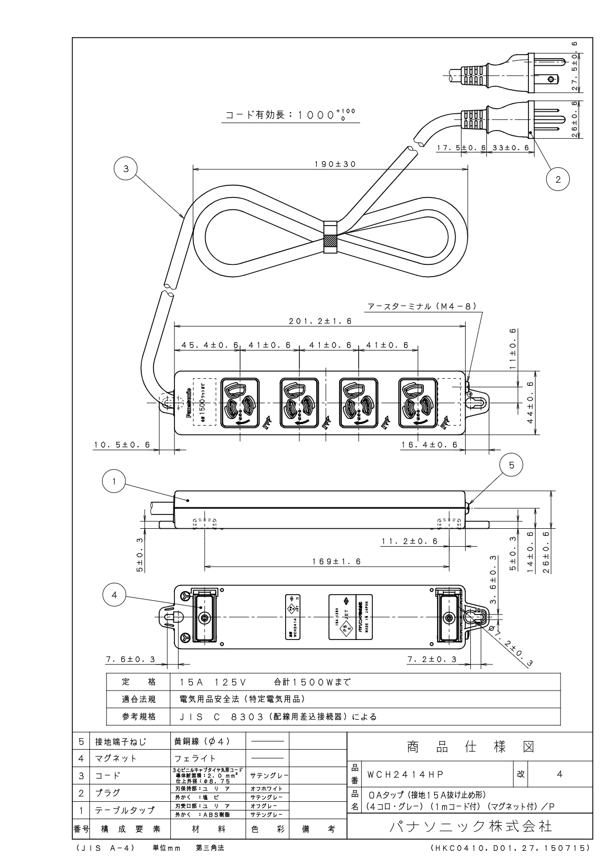品番:WCH2414HP品名:OAタップ(接地15A抜け止め形)(4コ口・グレー)(1Mコード付)(マグネット付)/P