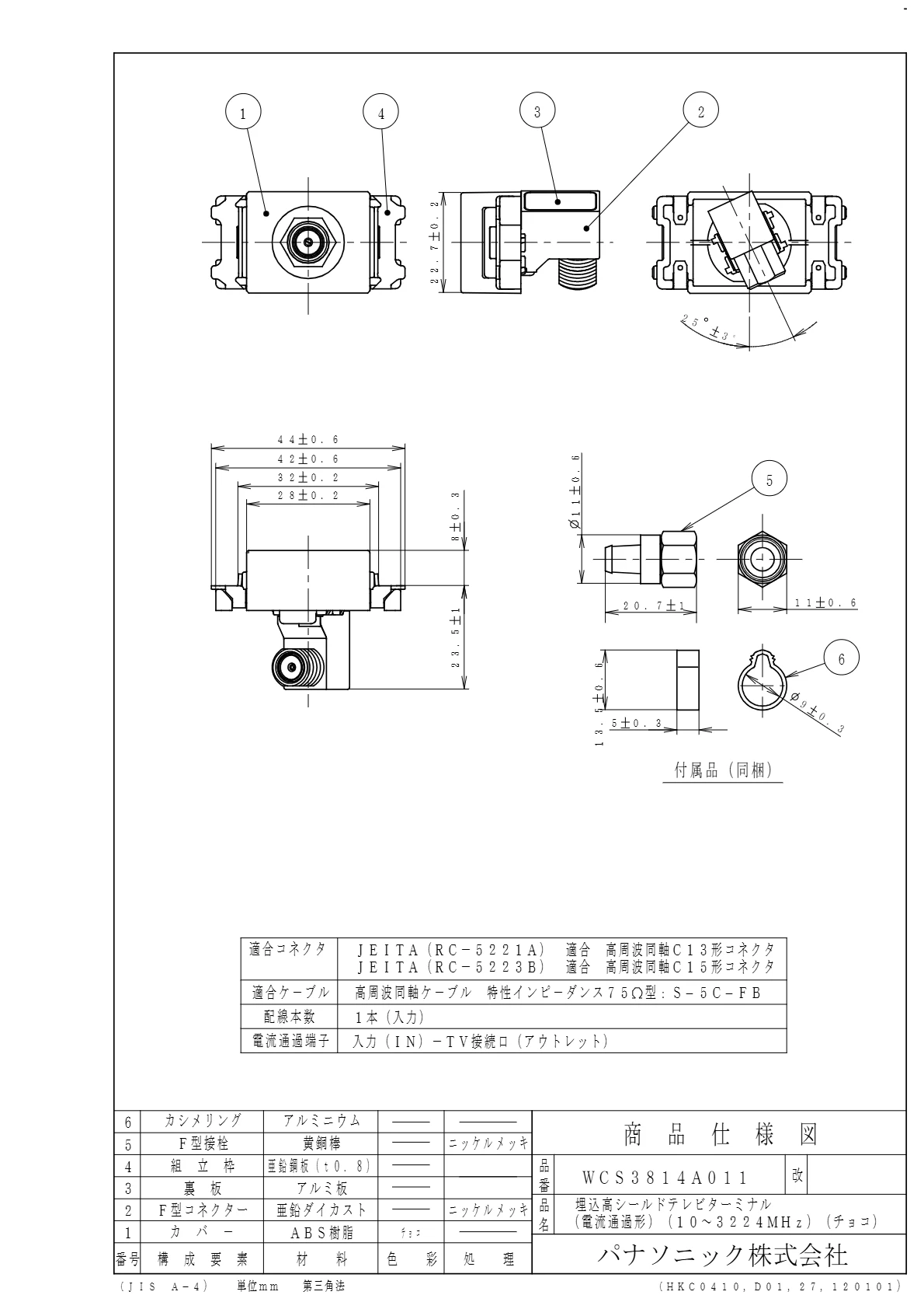 品番:WCS3814A011品名:埋込高シールドテレビターミナル(電流通過形)(10~3224MHZ)(チョコ)