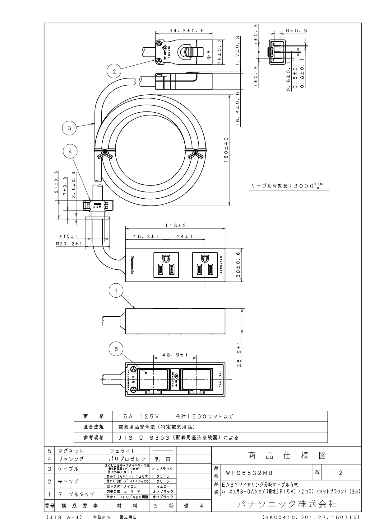 品番:WFS6532MB品名:EASYワイヤリング分岐ケーブル方式ハーネス用S-OAタップ(接地2P15A)(2コ口)(マットブラック)(3M)