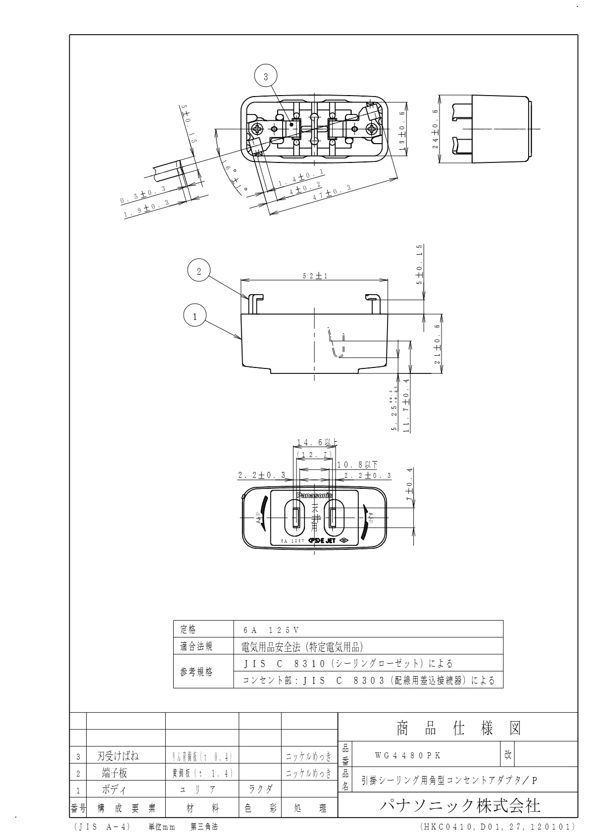 品番:WG4480PK品名:引掛シーリング用角型コンセントアダプタ