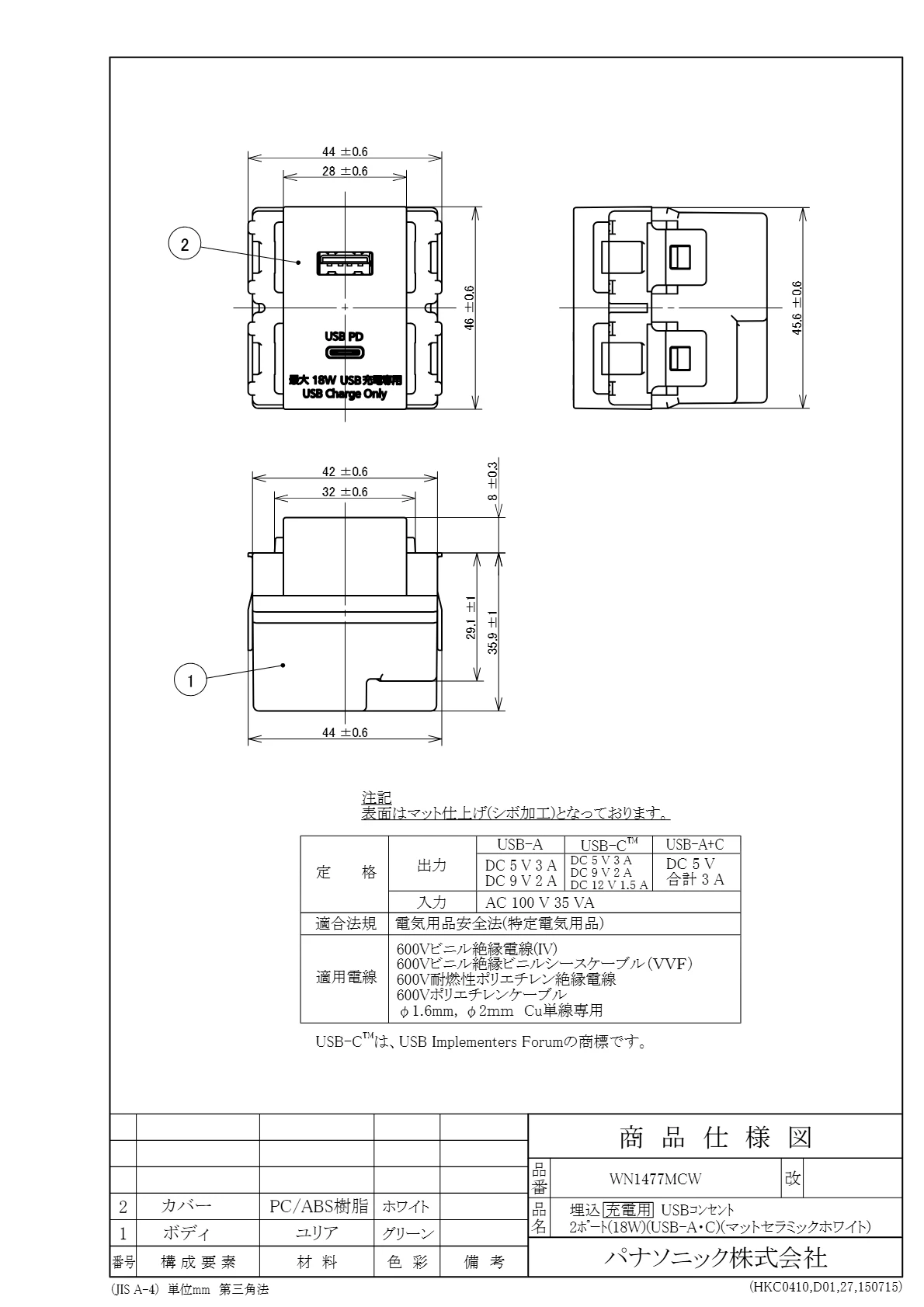品番:WN1477MCW品名:埋込充電用USBコンセント2ポート(18W)(USB-A・C)(マットセラミックホワイト)