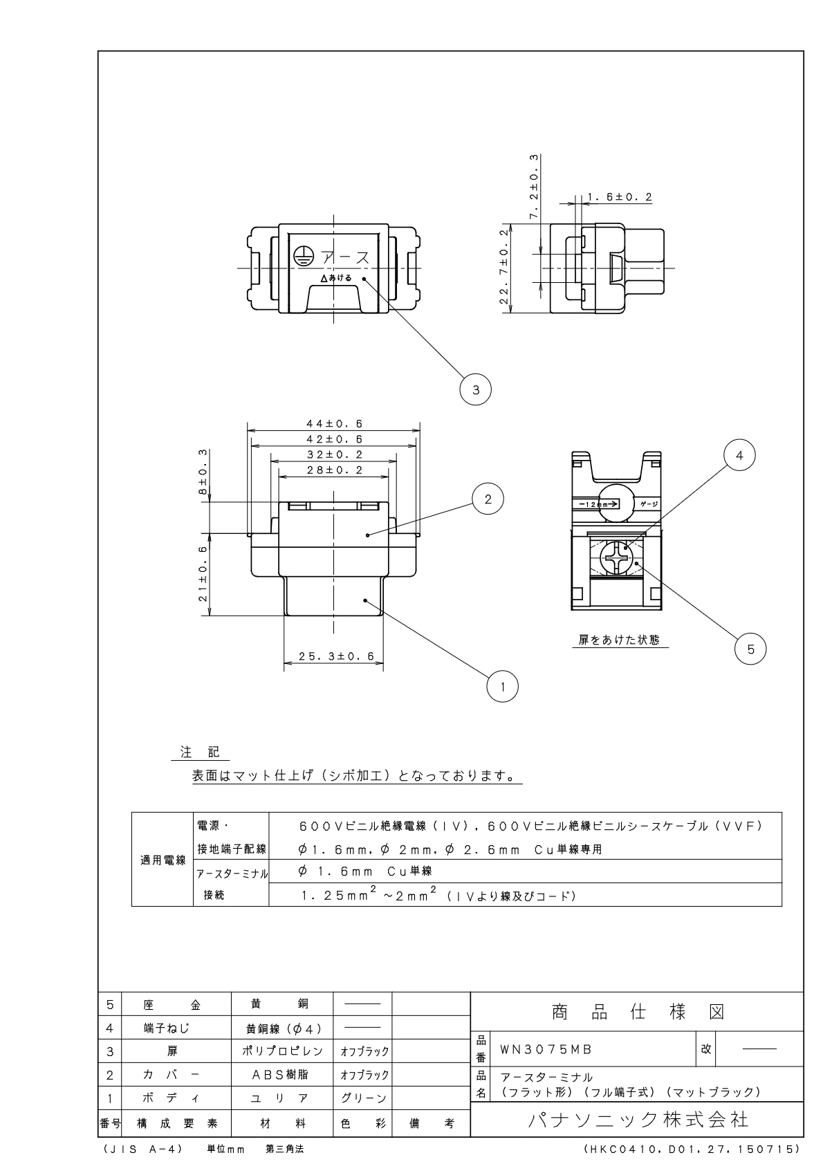 品番:WN3075MB品名:アースターミナル(フラット形)(フル端子式)(マットブラック)