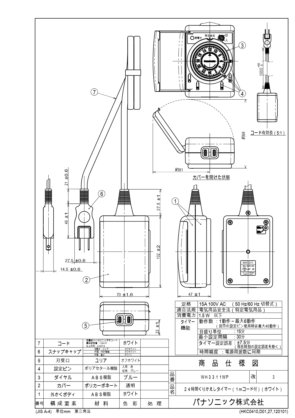 品番:WH3311WP品名:24時間くりかえしタイマー(1Mコード付)(ホワイト)