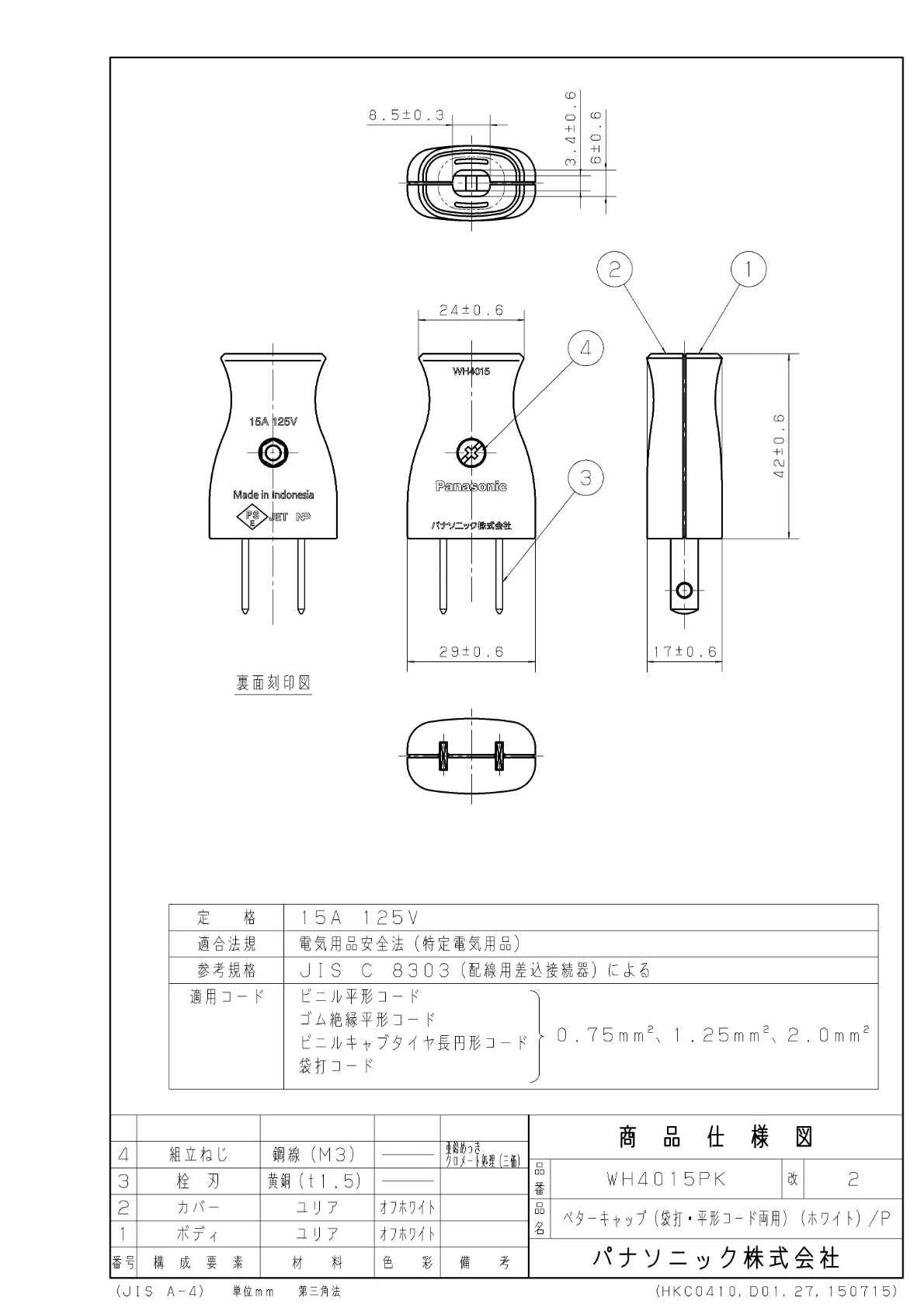 WH4015PK ベターキャップ(袋打・平形コード両用)(ホワイト)/プラスチック個装