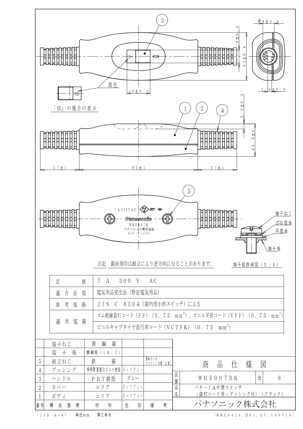 品番:WH5007BK品名:ベター7A中間スイッチ(袋打コード用・ブッシング付)(ブラック)