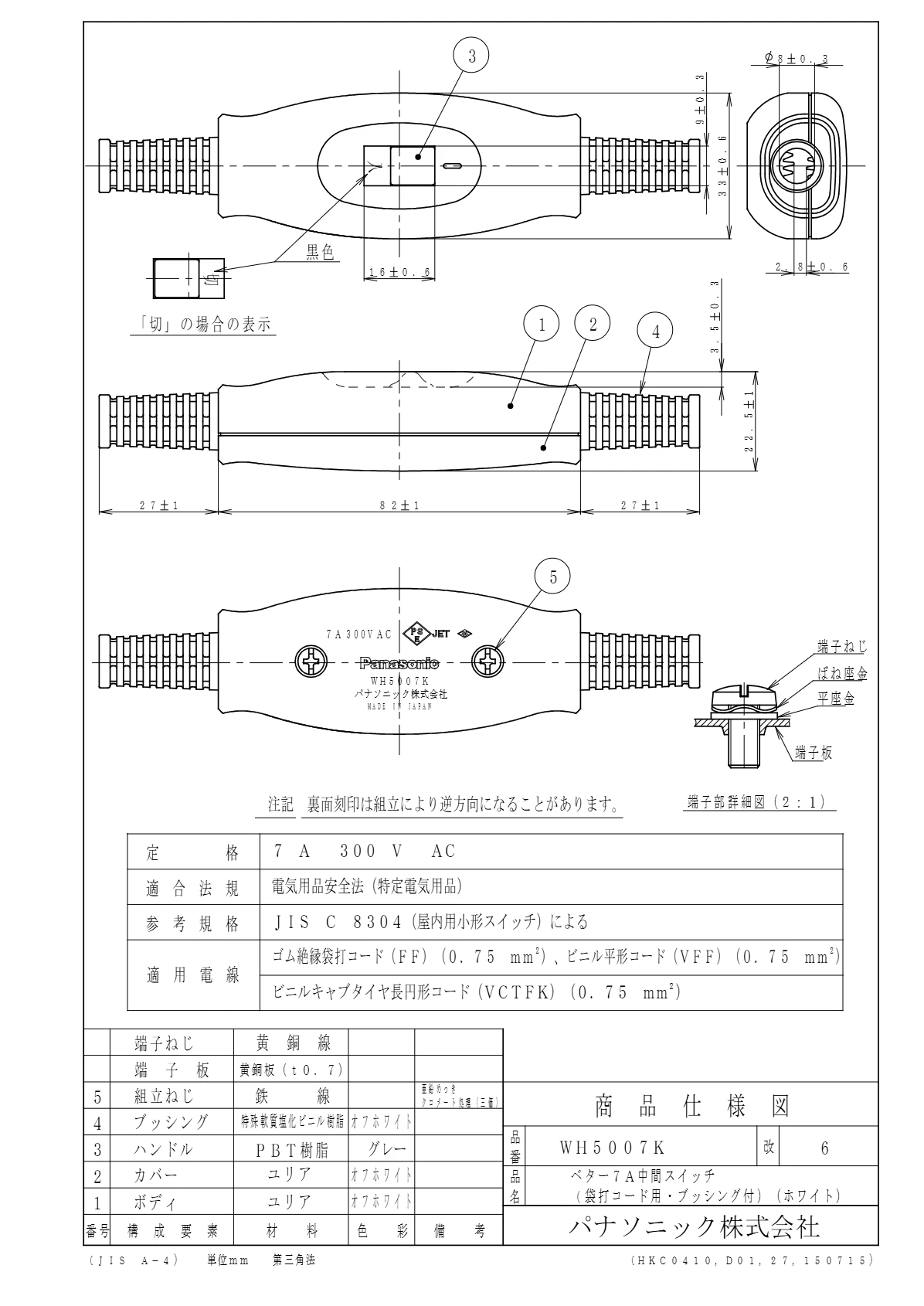 品番:WH5007K品名:ベター7A中間スイッチ(袋打コード用・ブッシング付)(ホワイト)