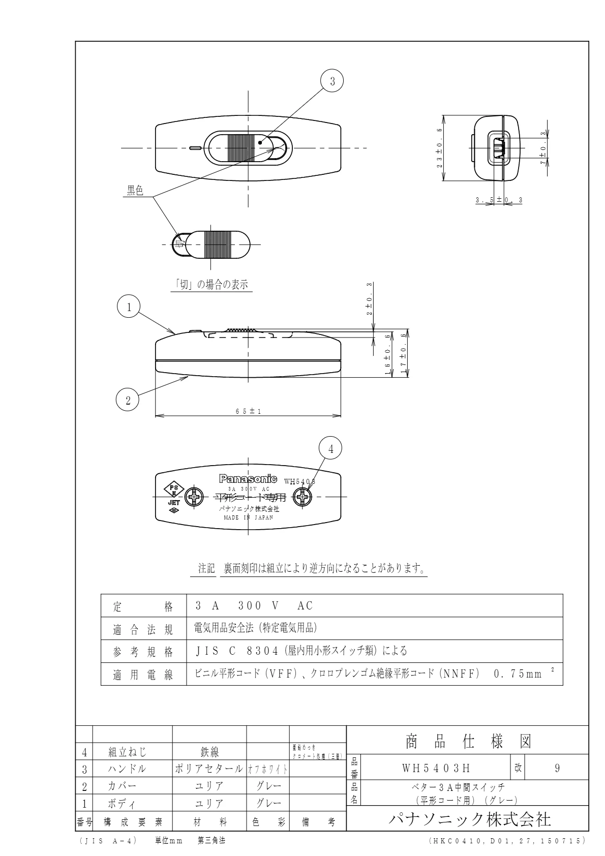 品番:WH5403H品名:ベター3A中間スイッチ(平形コード用)(グレー)