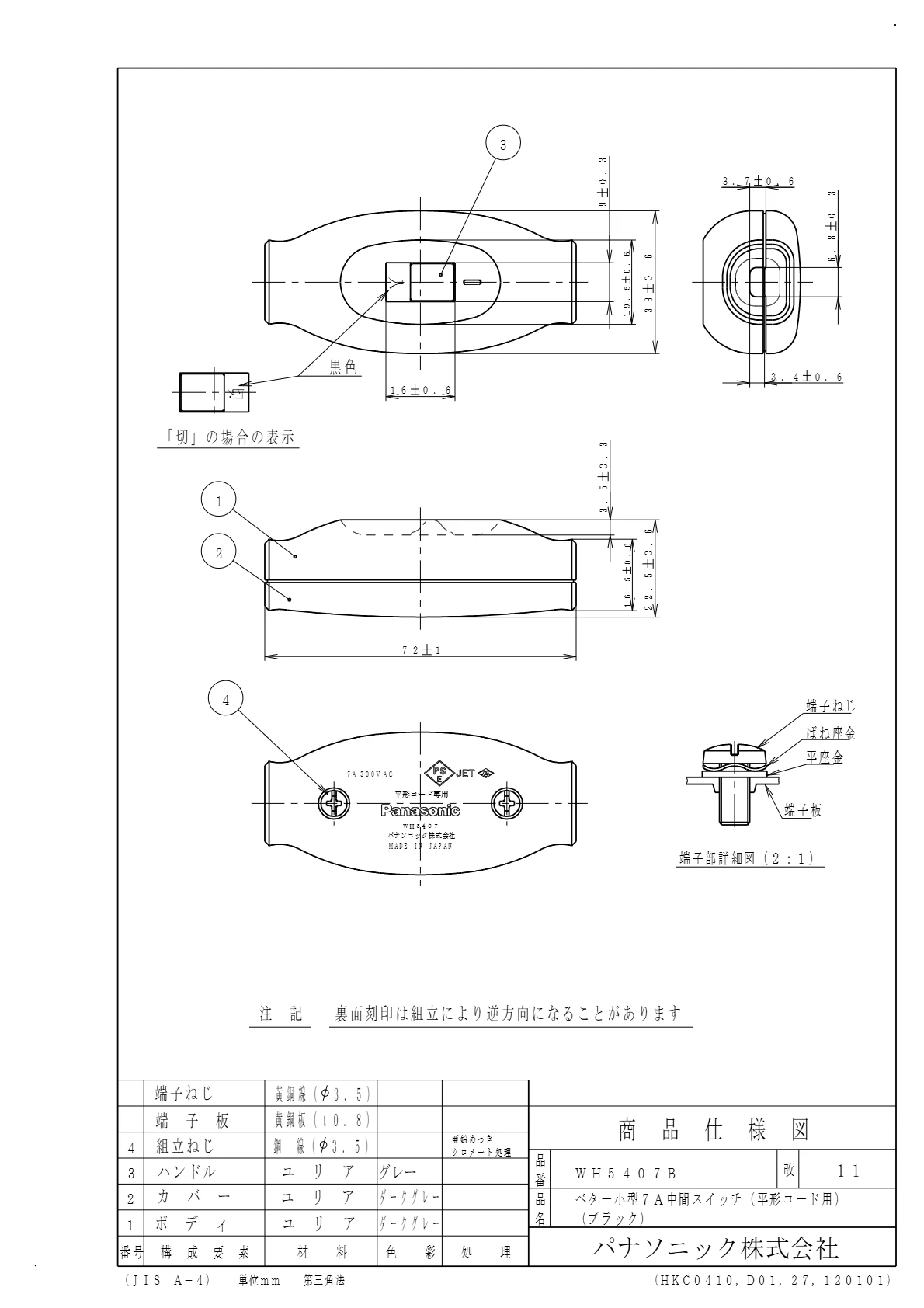 品番:WH5407B品名:ベター小型7A中間スイッチ(平形コード用)(ブラック)
