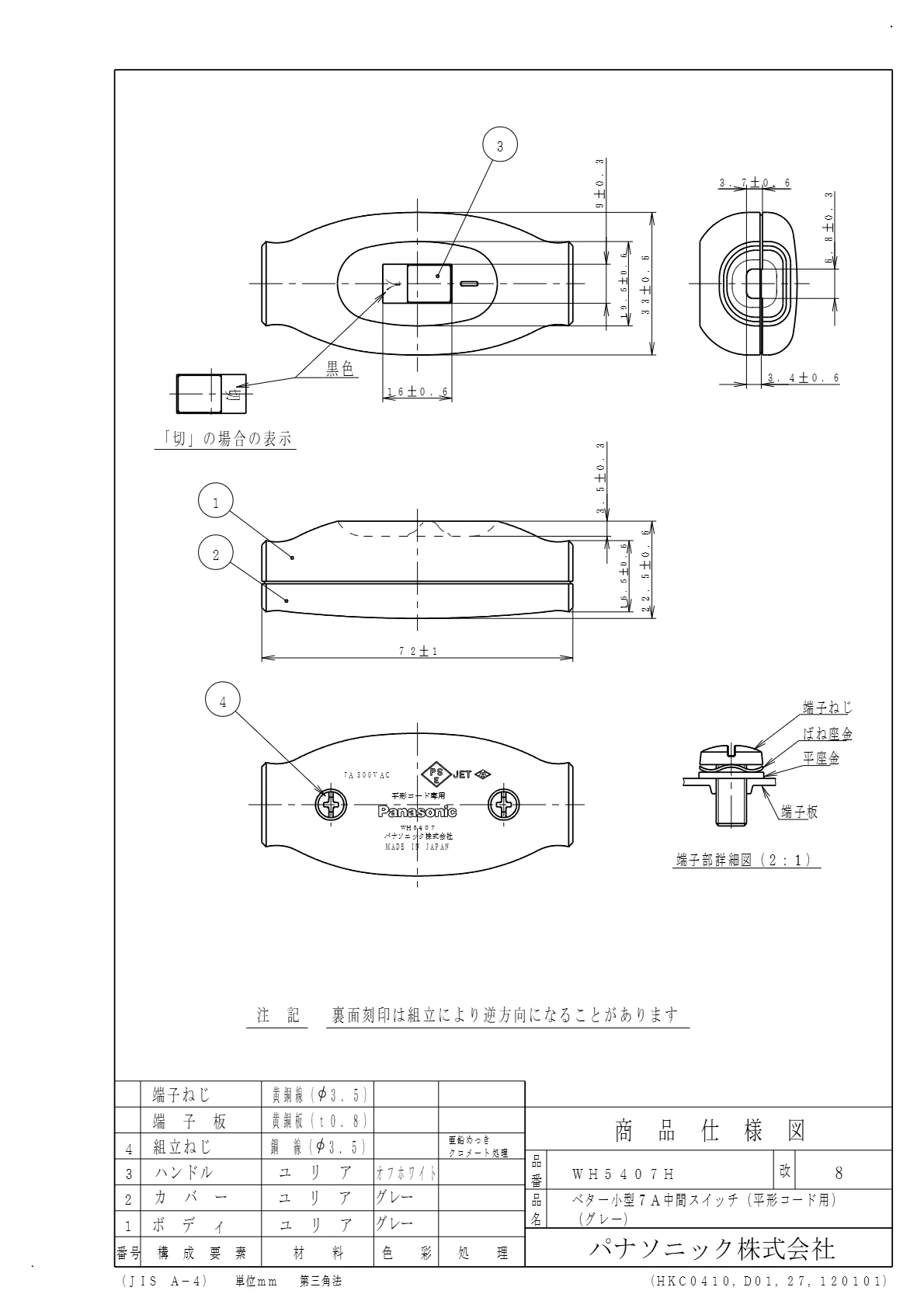 品番:WH5407H品名:ベター小型7A中間スイッチ(平形コード用)(グレー)