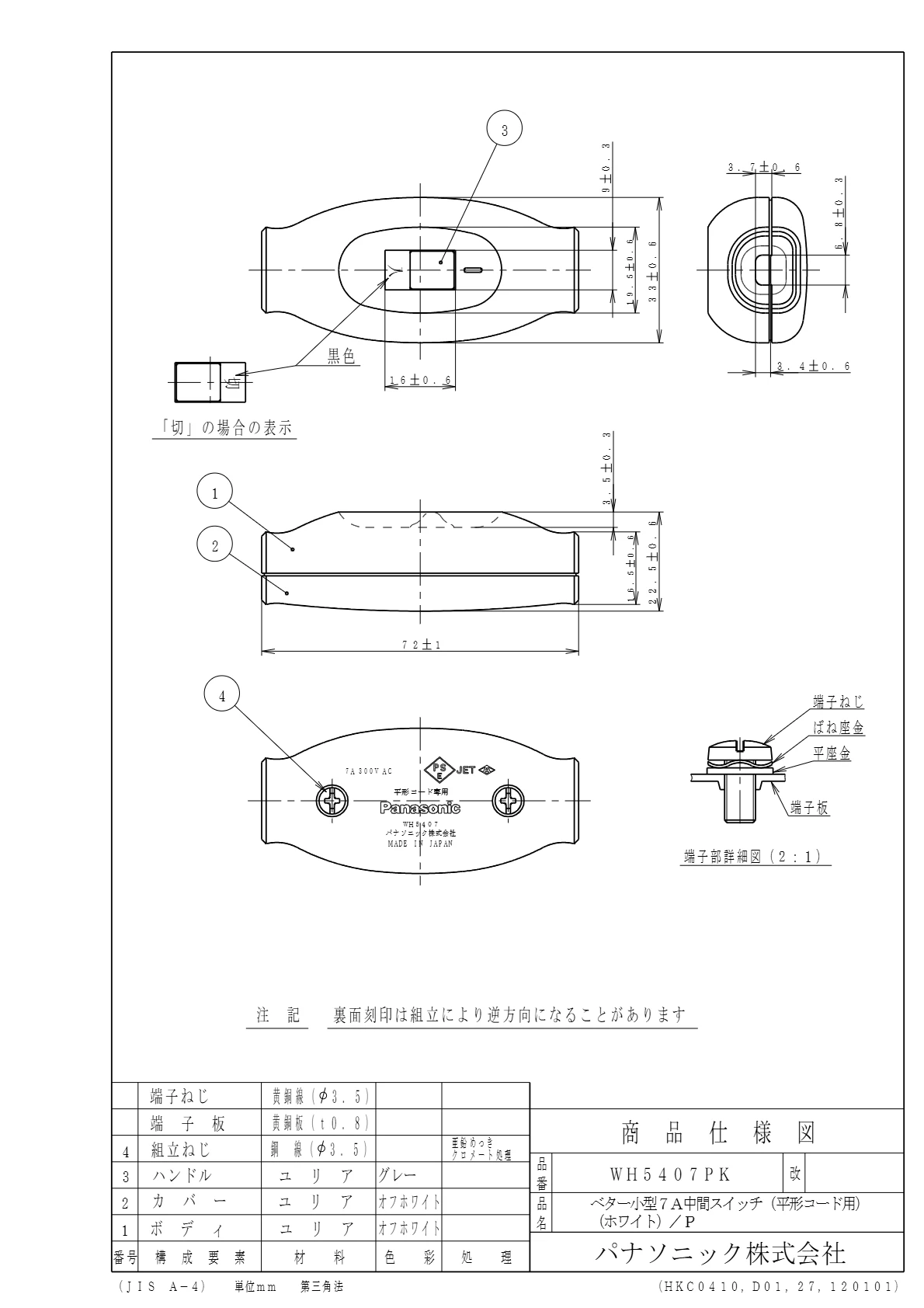 品番:WH5407PK品名:ベター小型7A中間スイッチ(平形コード用)(ホワイト)/プラスチック個装