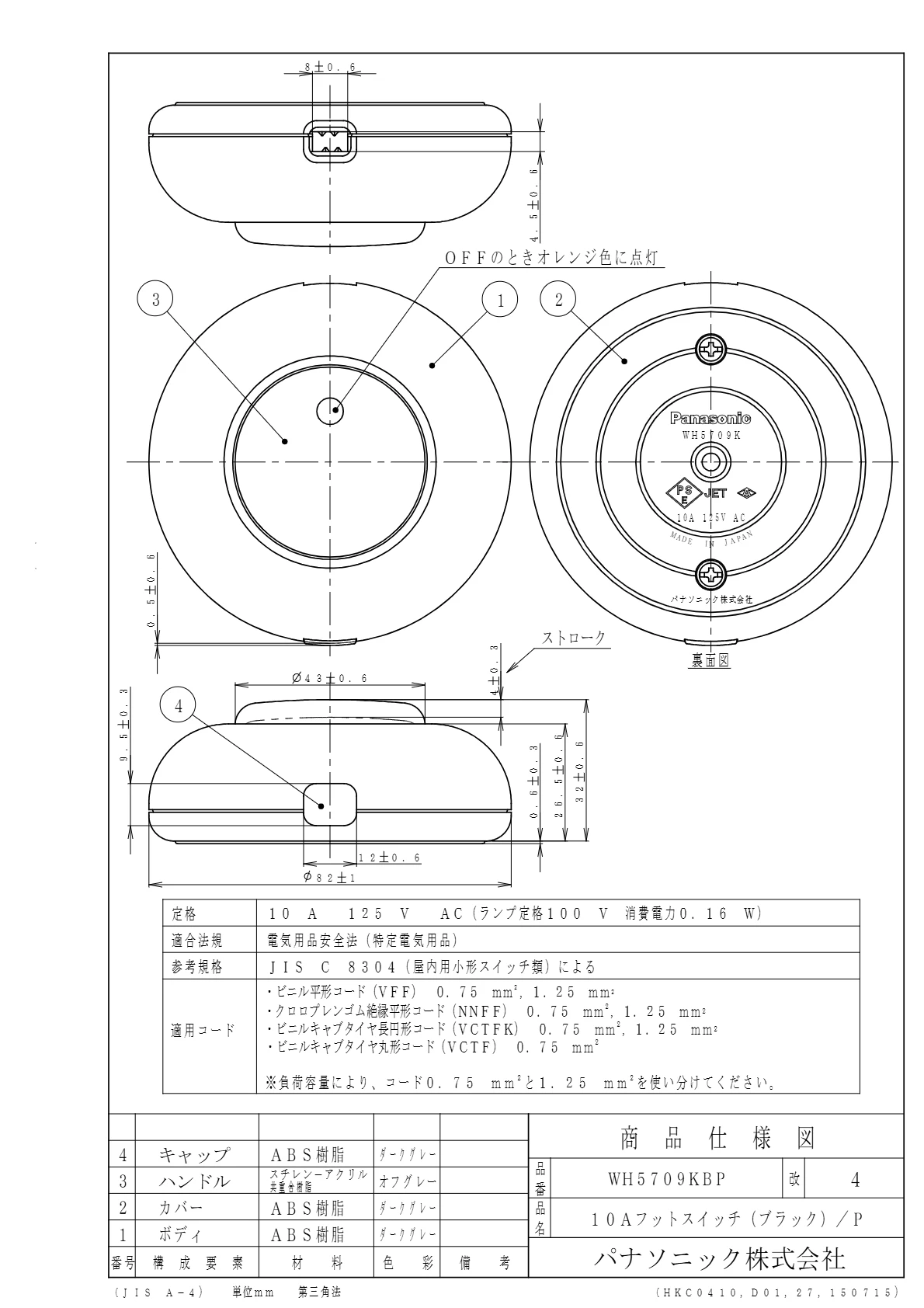 品番:WH5709KBP品名:10Aフットスイッチ(ブラック)/プラスチック個装10A125V