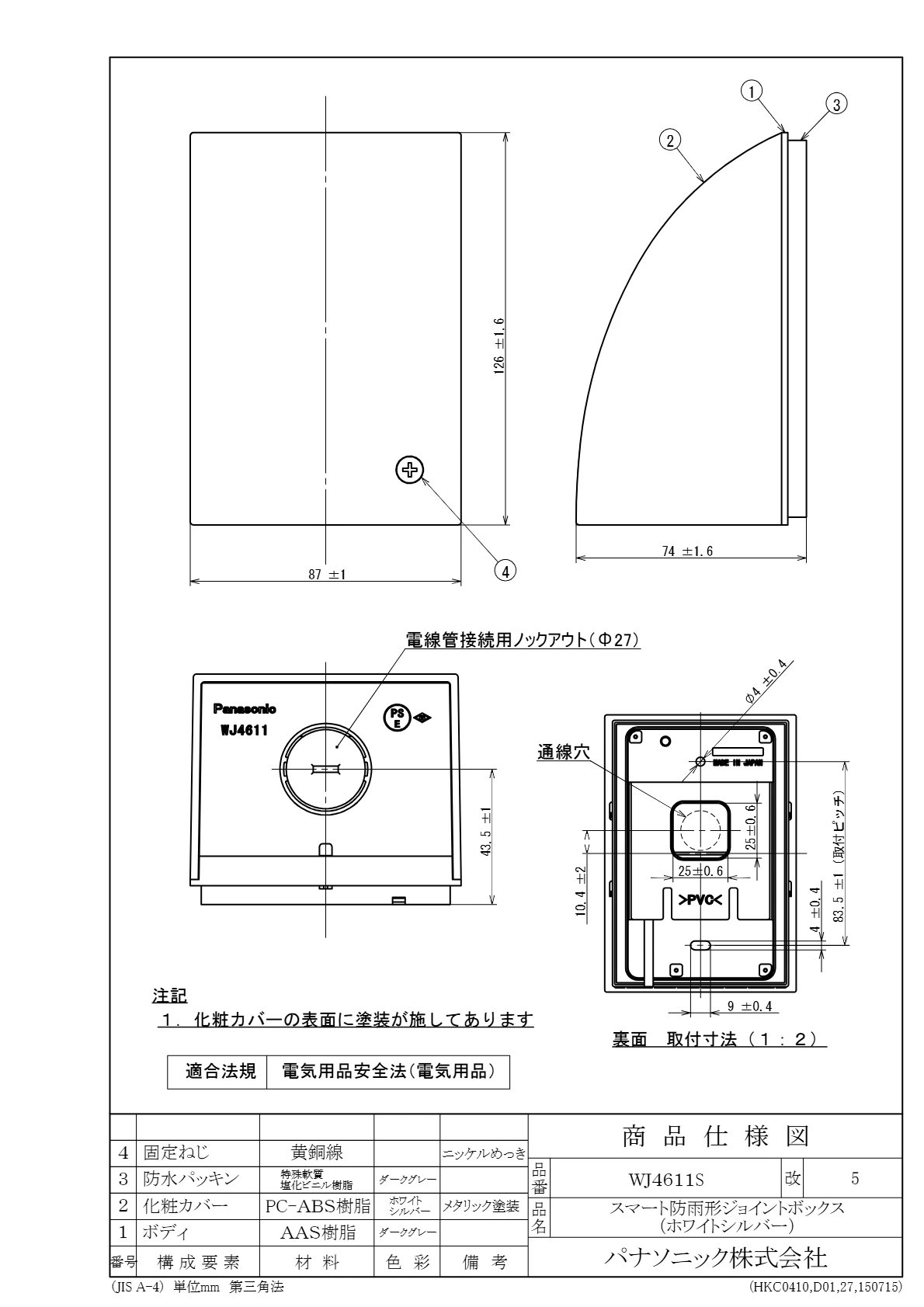 品番:WJ4611S品名:スマート防雨形ジョイントボックス(ホワイトシルバー)