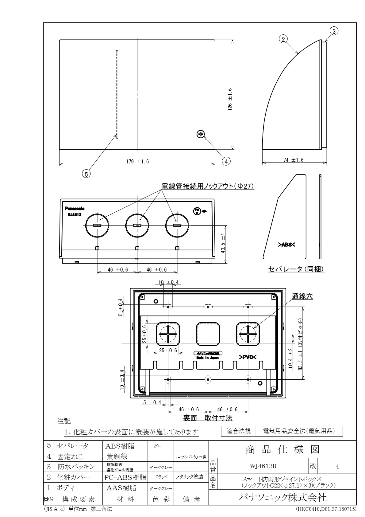 品番:WJ4613B品名:スマート防雨形ジョイントボックス(ノックアウトG22<φ27.1>×3)(ブラック)
