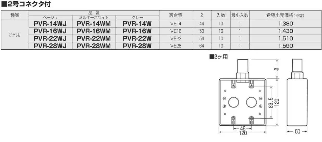 品番:PVR-16W品名:露出スイッチボックス 2号コネクタ付 2ケ用 グレー