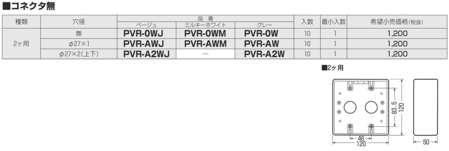 PVR-A2WJ 露出スイッチボックス コネクタなし 2ケ用 ベージュ