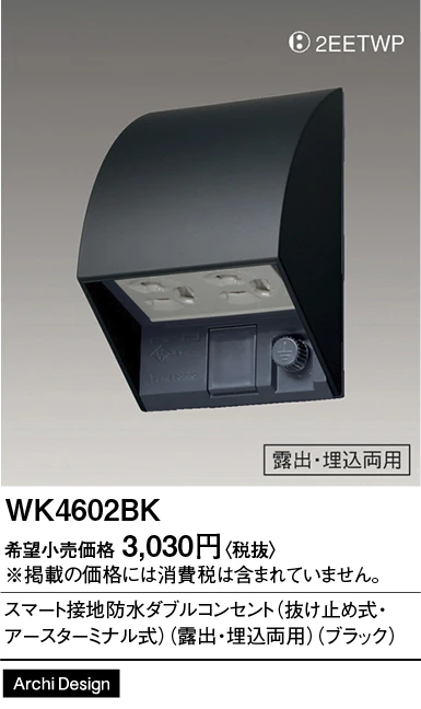 品番:WK4602BK品名:スマート接地防水ダブルコンセント(抜け止め式・アースターミナル式)(露出・埋込両用)(ブラック)