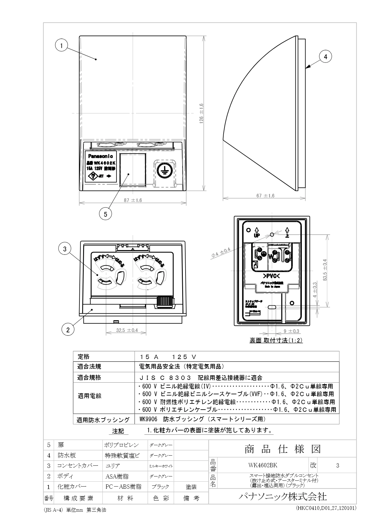 WK4602BK スマート接地防水ダブルコンセント(抜け止め式・アースターミナル式)(露出・埋込両用)(ブラック)